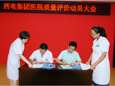 會(huì)上陳秀生院長(zhǎng)做了題為“聚全院之力,做好醫(yī)院質(zhì)量評(píng)價(jià)工作”的動(dòng)員報(bào)告,他首先闡述了開(kāi)展本次醫(yī)院質(zhì)量評(píng)價(jià)工作的目的和深遠(yuǎn)意義,并客觀、全面分析了醫(yī)院近年發(fā)展的有利形勢(shì)和工作的不足與差距,鼓勵(lì)大家不畏困難,堅(jiān)定信心,陳院長(zhǎng)對(duì)完成此項(xiàng)工作提出具體要求,強(qiáng)調(diào)全院上下要以醫(yī)院質(zhì)量評(píng)價(jià)為契機(jī),團(tuán)結(jié)奮進(jìn),再接再厲,加強(qiáng)內(nèi)涵建設(shè),內(nèi)強(qiáng)素質(zhì),外塑形象,不斷增強(qiáng)醫(yī)院的綜合競(jìng)爭(zhēng)力,面對(duì)時(shí)間緊、標(biāo)準(zhǔn)高、任務(wù)重的嚴(yán)峻挑戰(zhàn),全院干部、職工要經(jīng)得起考驗(yàn),要具有完成歷史使命的決心和信心,為最終創(chuàng)建“三甲”醫(yī)院而不懈奮斗。王雙全副院長(zhǎng)強(qiáng)調(diào)了醫(yī)院評(píng)價(jià)組織的保障功能,對(duì)各實(shí)施階段的重點(diǎn)工作進(jìn)行了詳細(xì)的安排和部署。會(huì)上婦產(chǎn)醫(yī)院、神經(jīng)內(nèi)科、影像科作為科室代表,就迎接此次醫(yī)院質(zhì)量評(píng)價(jià)做了表態(tài)發(fā)言。為明確職責(zé),落實(shí)責(zé)任,會(huì)上陳秀生院長(zhǎng)還與職能科室、內(nèi)科、外科、醫(yī)技科室、門診科室代表簽訂了《西電集團(tuán)醫(yī)院迎接醫(yī)院質(zhì)量評(píng)價(jià)責(zé)任書》。