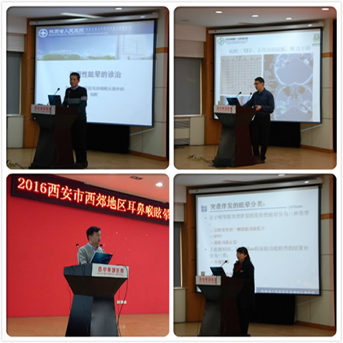 我院耳鼻喉科孫繼周主任主持會(huì)議,首先由西電集團(tuán)醫(yī)院候沛紅書記致歡迎詞,陜西省耳鼻喉醫(yī)學(xué)會(huì)許珉主委就耳鼻喉科現(xiàn)狀和發(fā)展做了詳細(xì)的講解,隨后由陜西省人民醫(yī)院劉暉教授、第四軍醫(yī)大學(xué)西京醫(yī)院耳鼻喉科陳陽(yáng)副教授、張文主任醫(yī)師,山西醫(yī)科大學(xué)陳剛剛主治醫(yī)師、西安交通大學(xué)第二附屬醫(yī)院張青副教授等就眩暈診治方面內(nèi)容進(jìn)行了學(xué)術(shù)交流。另外還邀請(qǐng)我院神經(jīng)內(nèi)科李會(huì)琪副主任從神經(jīng)內(nèi)科眩暈診治方面進(jìn)行了詳盡的講解。各位專家教授繪聲繪色的精彩演講,獲得了廣大與會(huì)者的一致好評(píng)。會(huì)議期間,大家認(rèn)真聆聽,學(xué)術(shù)氣氛濃厚,與會(huì)專家也分別就自己研究領(lǐng)域中遇到的問(wèn)題進(jìn)行了發(fā)言并廣泛征詢其他學(xué)者的意見(jiàn)。此次研討會(huì)的成功舉辦,不僅加強(qiáng)了西郊地區(qū)乃至西安市耳鼻喉科醫(yī)生的交流與合作,而且豐富了大家的專業(yè)知識(shí),拓寬了視角和思路,為共同探討眩暈診治提供了一個(gè)很好的平臺(tái)。