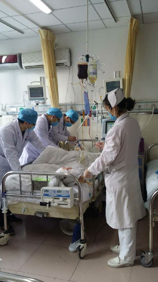11:50,兩頭班護士還未走進監(jiān)護室,熟悉的鈴聲就已經(jīng)響起:”快叫醫(yī)生,搶救病人?!岸藭r車主任、代理護士長、王鵬醫(yī)生都在奮力搶救41床患者,正準備下班的解利平醫(yī)生不顧下夜班的辛苦與放下手頭工作的馮磊醫(yī)師一起對患者進行搶救,白班護士董欣欣、安羽積極配合醫(yī)生,兩頭護士很自覺的觀察其他病人的病情。在馮磊醫(yī)生為患者行氣管插管術(shù),董欣欣護士遵醫(yī)囑為患者進行呼吸機輔助呼吸后,患者呼吸、心跳恢復(fù);而就在此時張麗萍護士發(fā)現(xiàn)另外一名重癥患者瞳孔散大,意識障礙較前加重,這邊剛松下一口氣的大家又緊張的進入了對該患者的搶救中,此時是中午1:00。
