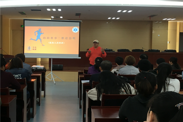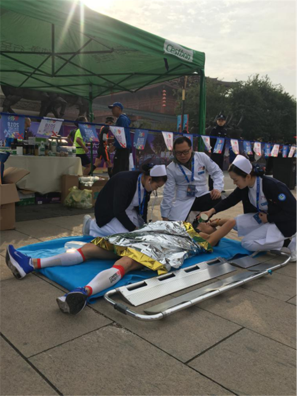 比賽開(kāi)始后,醫(yī)療站點(diǎn)的所有醫(yī)務(wù)人員開(kāi)始了緊張的保障工作,大家分工明確,配合默契,積極應(yīng)對(duì)各種情況。醫(yī)院所保障的是半程馬拉松的19KM處,由于已快到終點(diǎn),許多運(yùn)動(dòng)員出現(xiàn)肌肉拉傷、體力不支等現(xiàn)象,醫(yī)療保障工作關(guān)系到所有運(yùn)動(dòng)員的健康,所有隊(duì)員不敢有一絲一毫的松懈。